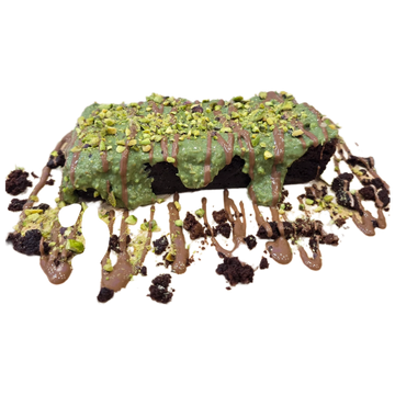 Looking for a share worthy treat indulge in this triple choc brownie coated in creamy dubai chocolate, milk chocolate and pistachio.